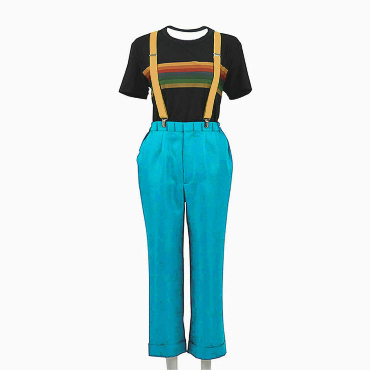 - Adult Dr Jodie Fancy Dress Costume Ladies TV Fancy Dress Complete Outfit, Includes: Light grey coat with belt, Black t-shirt with stripes, Yellow braces with fastenings, Blue pants. Available Size: Small (UK 10-12), Medium (14-16), Large (18-20), Kindly advise to check the size guide before placing the order